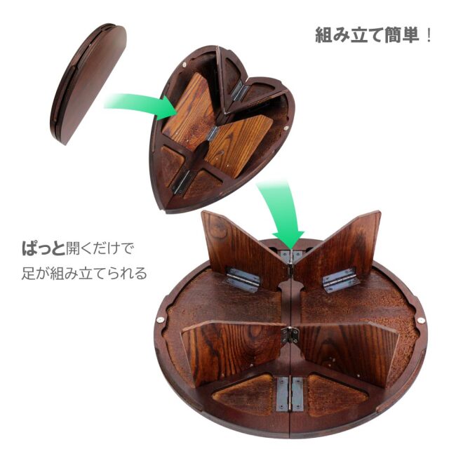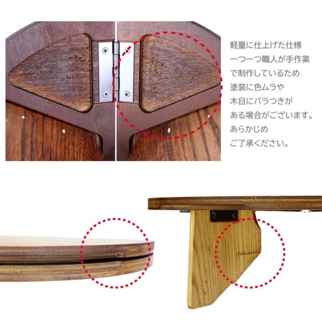職人が一つ一つ手作業で作製している木製折り畳み丸テーブル。 ワンタッチ組み立てで面倒な工程なし! コンパクトで持ち運びに便利、ソロキャンプにおすすめです。 天板には滑り止め加工が施してあり、物が滑りにくくなっています。 木目や節など一つ一つが異る風合いをお楽しみ下さい。 キャンプ以外にも川辺や登山など幅広い場所で活躍します! |
